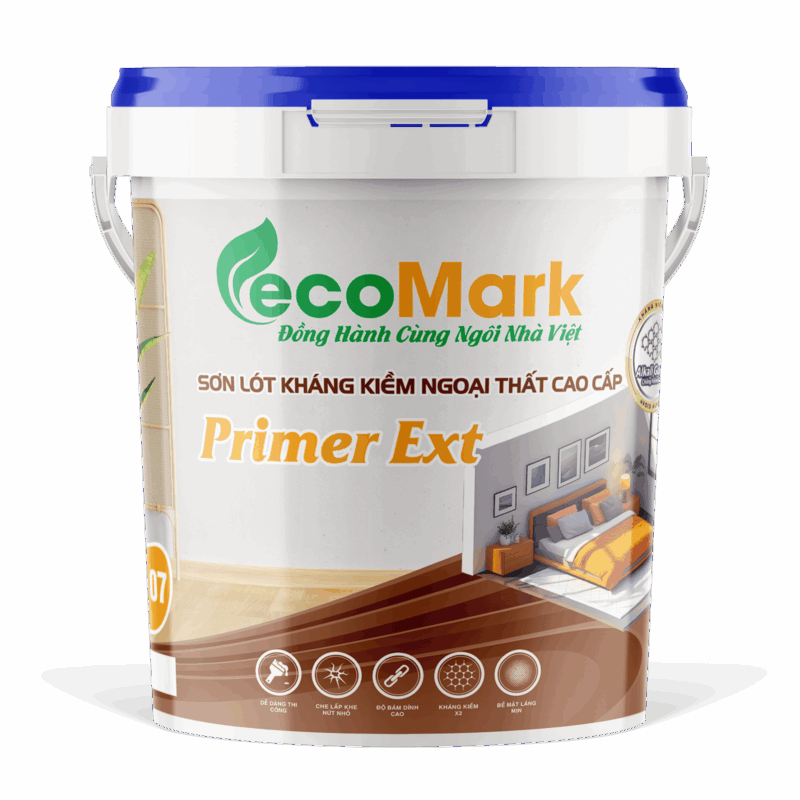 SƠN LÓT KHÁNG KIỀM NGOẠI THẤT CAO CẤP_E107:Sơn Lót Kháng Kiềm Ngoại Thất Cao Cấp Ecomark là loại sơn lót chuyên dụng dùng trước khi phủ các lớp sơn hoàn thiện. Sản phẩm được nghiên cứu phù hợp với điều kiện khí hậu Việt Nam, có khả năng thẩm thấu sâu nhờ cấu trúc hạt polymer siêu nhỏ, giúp liên kết chặt với bề mặt, tăng cường độ bền cơ lý và khả năng kháng kiềm cho công trình ngoại thất.