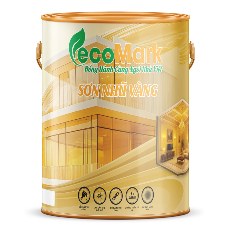 SƠN NHŨ VÀNG :Sơn Nhũ Vàng Ecomark là loại sơn trang trí cao cấp có độ bóng cao, tạo bề mặt óng ánh, lung linh, mang lại hiệu ứng thẩm mỹ sang trọng cho cả không gian nội thất và ngoại thất. Sản phẩm thường được sử dụng để tạo điểm nhấn cho tường, cột, bê tông tại các công trình nhà ở, khách sạn, resort, lâu đài và các hạng mục trang trí cao cấp.