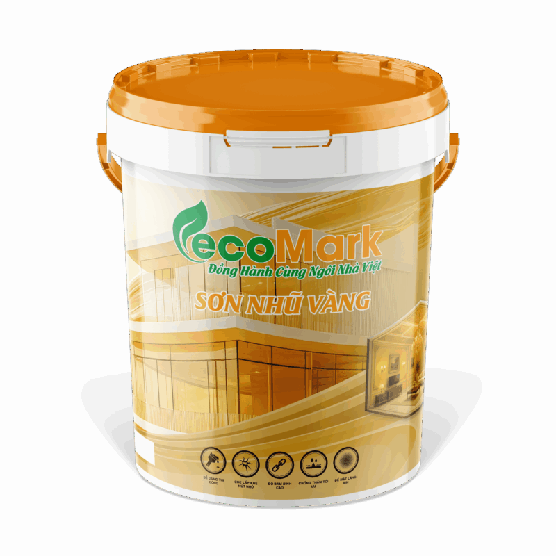 SƠN NHŨ VÀNG :Sơn Nhũ Vàng Ecomark là loại sơn trang trí cao cấp có độ bóng cao, tạo bề mặt óng ánh, lung linh, mang lại hiệu ứng thẩm mỹ sang trọng cho cả không gian nội thất và ngoại thất. Sản phẩm thường được sử dụng để tạo điểm nhấn cho tường, cột, bê tông tại các công trình nhà ở, khách sạn, resort, lâu đài và các hạng mục trang trí cao cấp.